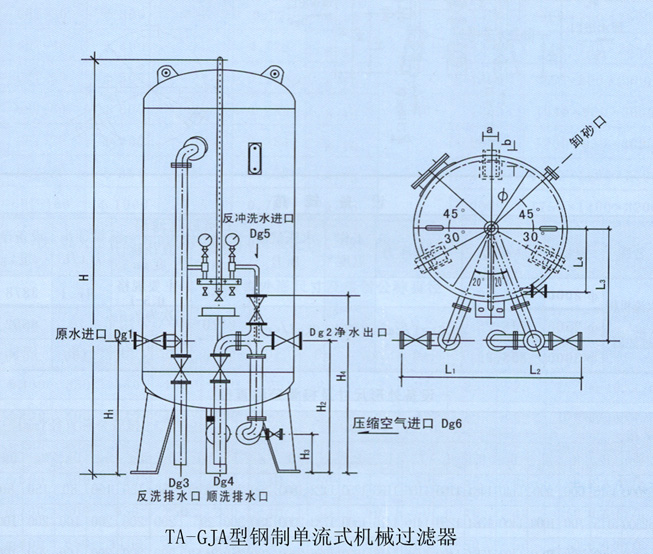 单流式机械过滤器的管道简单,运行平稳。过滤流速一般为4-50m/h,运行周期一般为8小时。双流式机械过滤器上下两端设有进水装置,中部设有出水装置。其优点是过滤水量较大,除污能力较高,运行周期长,一般为20小时,缺点是管道系统较为复杂,运行不太稳定,冲洗换料较为困难。